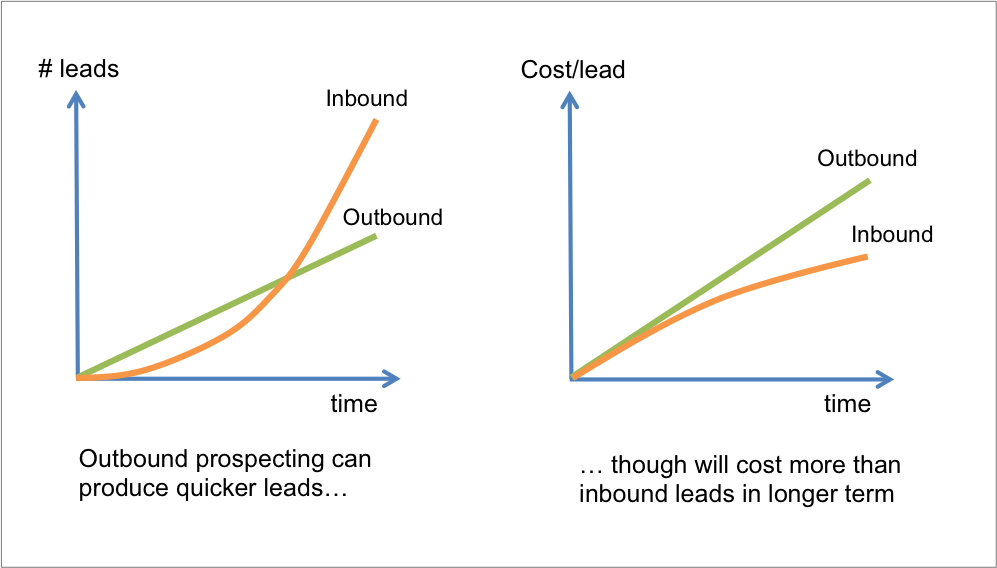 But if you need to produce leads fast, outbound prospecting will get you there faster than inbound marketing techniques. You should compare the time it takes a Business Development (BD) rep to get productive (typically 2-4 weeks for first appointments; 2-3 months to full productivity, as in my last company) with the time it will take to get the equivalent number of inbound leads (8-12 months? more? Results vary greatly per company).